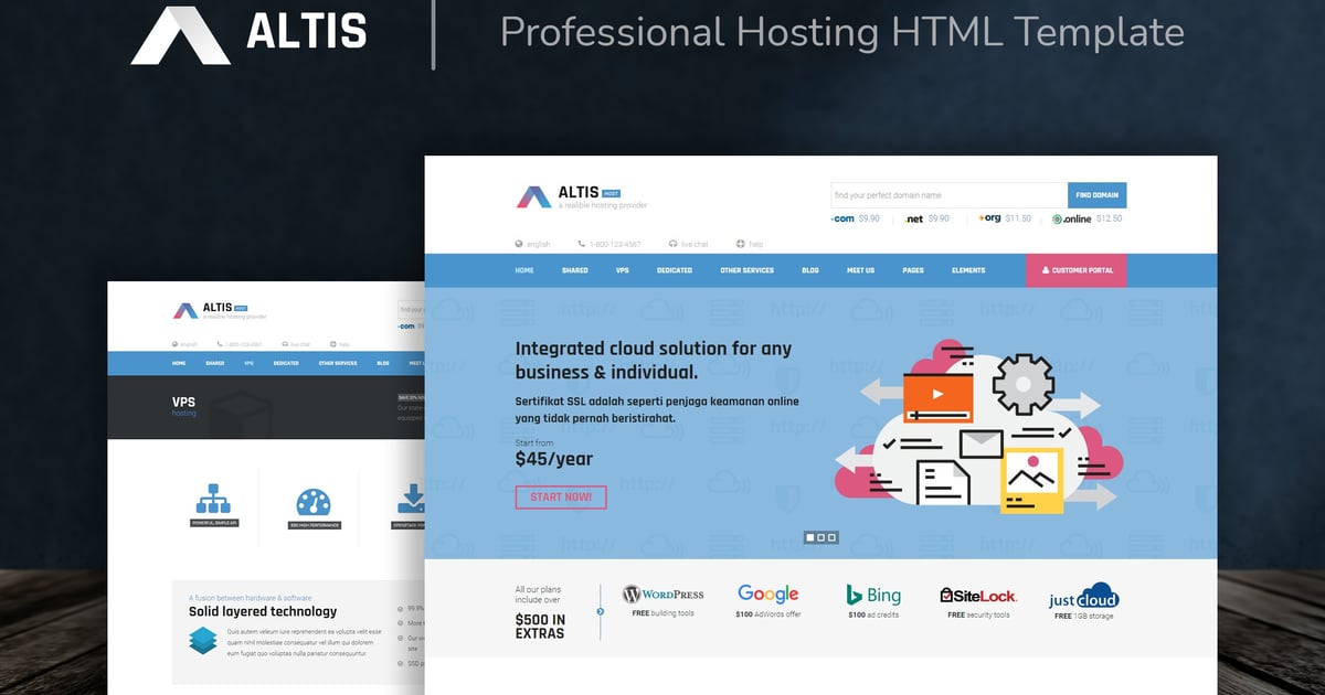 Altis ist eine professionelle Webhosting-Vorlage. Geeignet für Webhosting-Unternehmens-/Unternehmenswebsites, kann aber mit einigen Änderungen für jede Art von Website verwendet werden. Altis ist sofort einsatzbereit und kann hauptsächlich f ür Hosting-Unternehmen verwendet werden. Sie können das Erscheinungsbild jedoch verwenden und ändern, um es an Ihr Unternehmen anzupassen