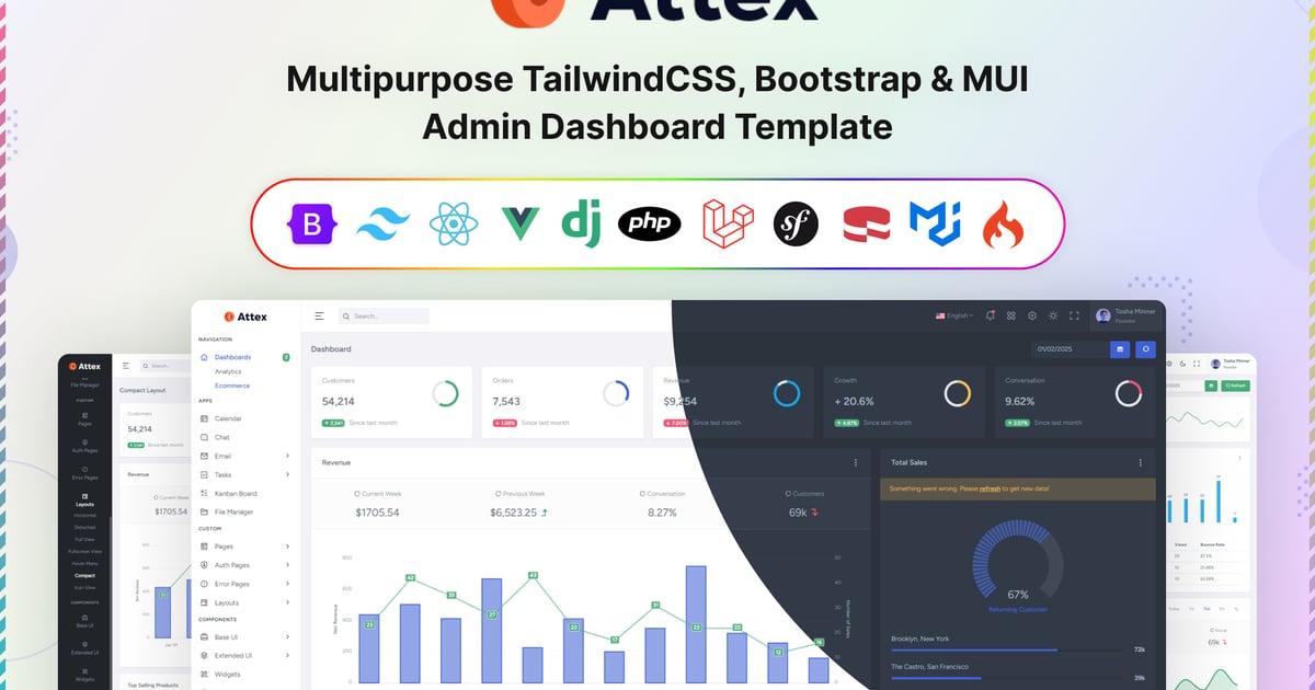 Attex — Das Mehrzweck-TailwindCSS-, Bootstrap- und MUI Admin-Dashboard-Template ist eine vielseitige Lösung, die mit modernen Frontend-Frameworks und Styling-Bibliotheken erstellt wurde. Es enthält Versionen, die sowohl Bootstrap als auch Tailwind CSS verwenden, um ein flexibles Design zu gewährleisten. Mit Bootstrap 5. lässt sich das Projekt nahtlos in React, Vue 3, Laravel 11, Symfony, PHP, Django und andere Backend-Technologien wie CakePHP und CodeIgniter 4 integrieren. Die CSS-v3-Versionen von Tailwind bieten einen eher auf Utilitys basierenden Designansatz und sorgen in Kombination mit React JS, Laravel 11, PHP, Django und anderen Frameworks für eine schlanke Benutzeroberfläche. Egal, ob Sie einen traditionellen Bootstrap-Ansatz oder einen modernen Tailwind-CSS-Workflow bevorzugen, dieses Projekt ist so konzipiert, dass es unterschiedlichen Entwicklungsanforderungen gerecht