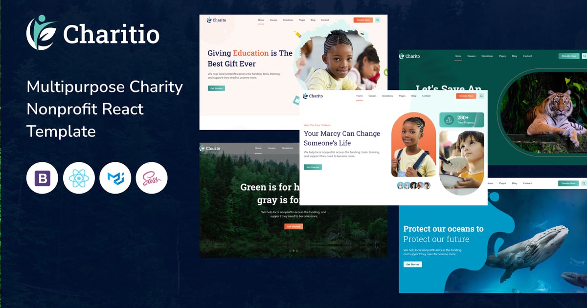 Charitio ist eine React-Vorlage für gemeinnützige Organisationen für mehrere Zwecke. Es ist eine moderne, schöne, elegante Vorlage für gemeinnützige Organisationen. Sie können den gesamten Abschnitt nach Belieben ändern. Es gibt eine individuelle Option und jeder Abschnitt ist einzigartig kreativ für NonProfit Charity. Es hat ein einzigartiges Design mit tollen Funktionen für gemeinnützige Organisationen, Bildungseinrichtungen, Wildtiere, Meeresverschmutzung, Weltpandemie und Natur. Websites, die ihre Website erstellen möchten, haben alle Funktionen für wohltätige Zwecke eingebaut, die eine gemeinnützige Website benötigen. Dort ist jeder Bereich einzigartig kreativ. Es sieht auf Mobilgeräten und Desktops großartig aus. Es ist sauber und einfach
