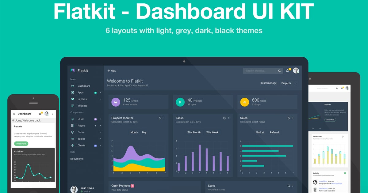 Flatkit zielt darauf ab, ein Beauty-Web-UI-Kit für Ihre nächste Anwendung bereitzustellen. Hier sind einige Vorteile, die Sie von Flatkit erhalten können: Bootstrap 4-CSS-Framework, AngularJS-Framework, HTML-Version mit Ajax, Grunt-Aufgabe für Profis, Bower-Paketverwaltung, Sass, Unbegrenzte Farben, helle, graue, dunkle, schwarze Themen; 6 vorgefertigte Layouts; Modernes Design, nicht nur ein Administrator