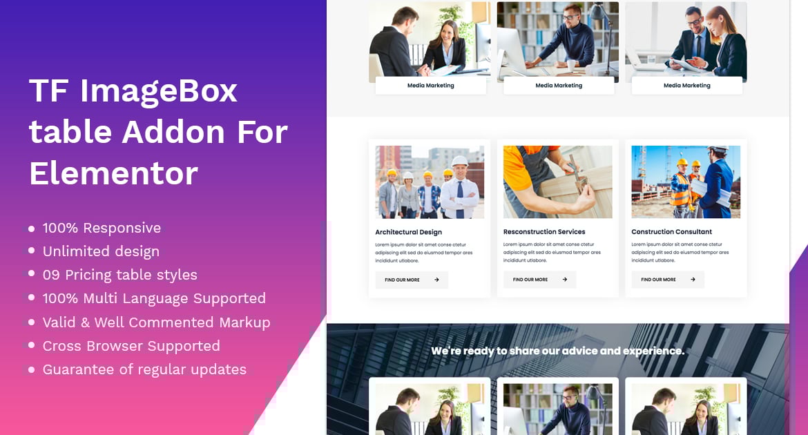 TF ImageBox Addon können Sie auf einfache und flexible Weise Bilder mit coolen und interaktiven Hover-Effekten in Ihre Website einfügen. Dieses Addons fügt Elementor Page Builder neue Elemente/Widgets hinzu. Es hilft Ihnen, auf einfache Weise die perfekte ImageBox für die Verwendung von Websites Elementor zu entwerfen.