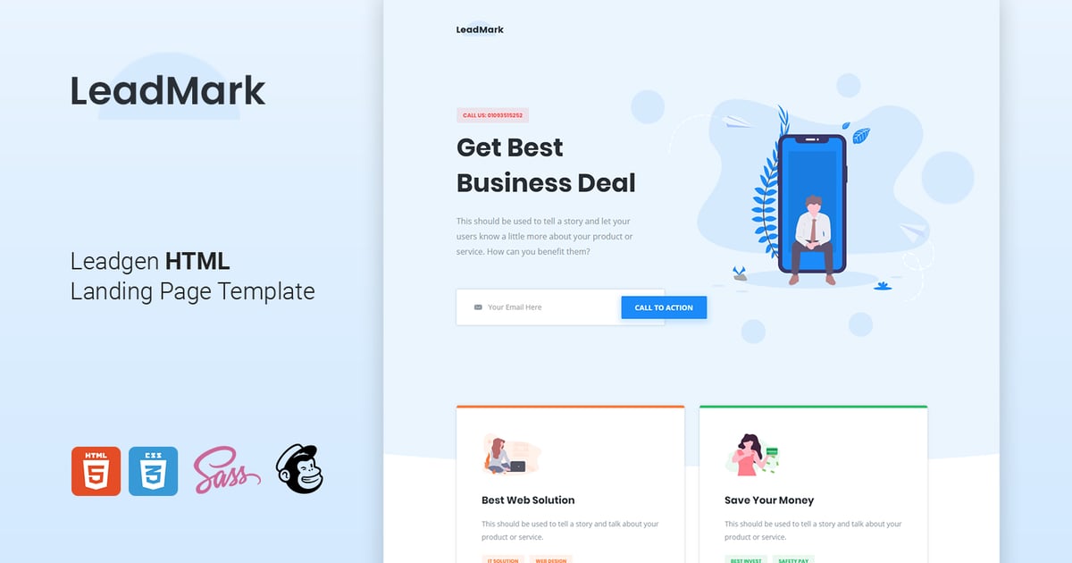 LeadMark ist eine flexible HTML5-Landingpage für Unternehmen. Diese Vorlage bietet viele verschiedene Möglichkeiten, mit denen Sie auf einfache Weise eine schöne, atemberaubende und einzigartige Landingpage erstellen können.