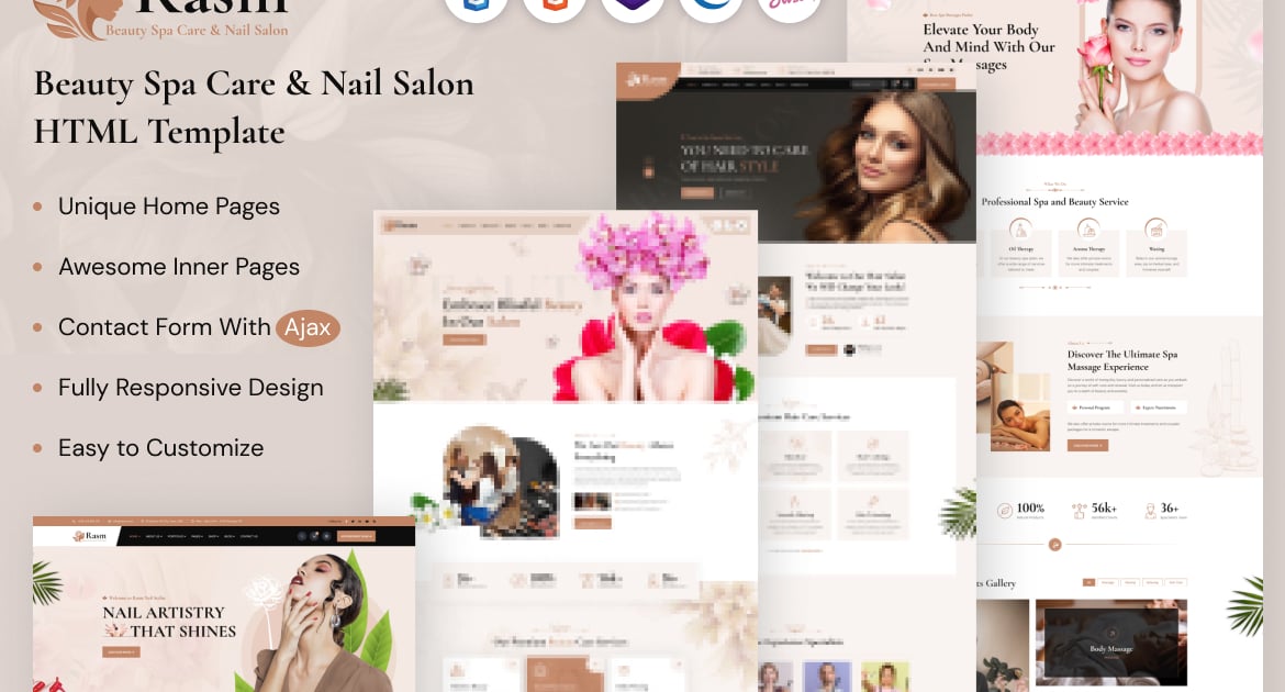 Vollständig ansprechende HTML-Vorlage für Beauty Spa, Pflege und Nagelstudio von Rasm Die Rasm Beauty Spa Care & Nail Salon HTML-Vorlage ist vollständig optimiert, um auf vielen Geräten und Bildschirmen wie Desktops, Smartphones, Laptops, Tablets, iPods, MacBooks usw. gut zu funktionieren. Darüber hinaus eignet sie sich hervorragend für verschiedene Browser wie Safari, Chrome, Firefox, Opera