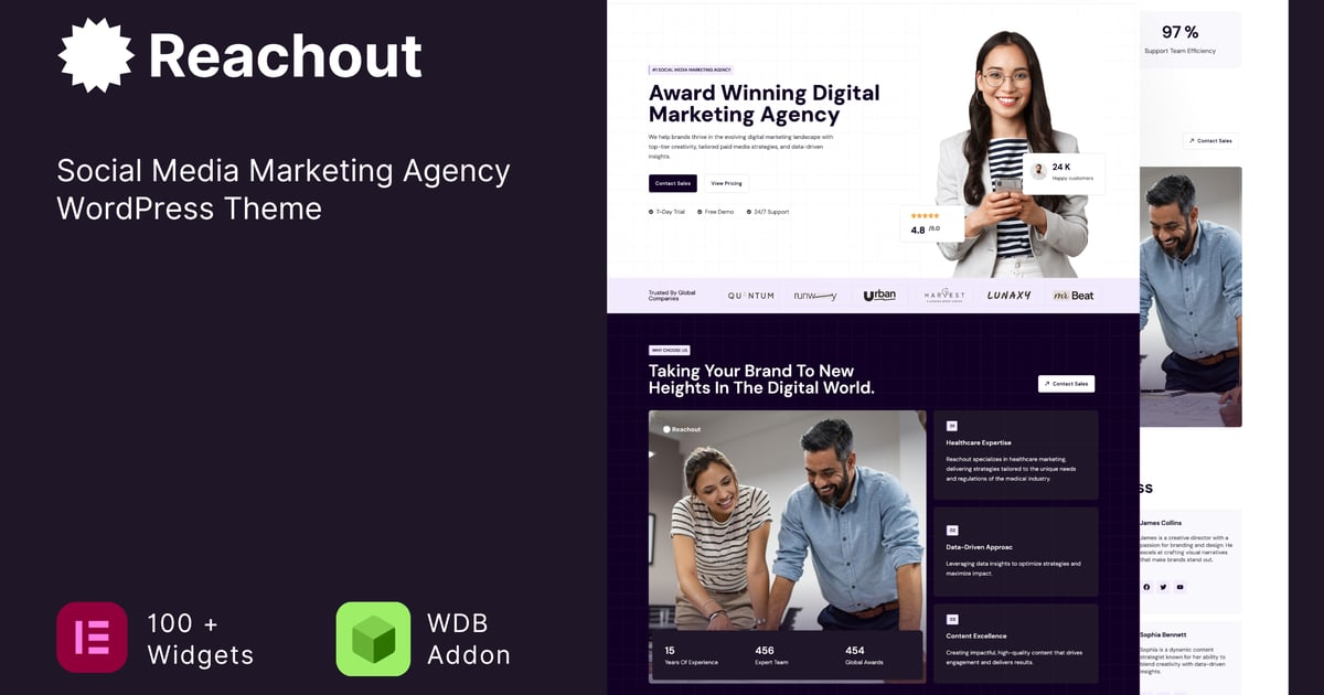 Wir stellen vor: Reachout — Das ultimative WordPress-Thema für Social-Media-Marketingagenturen, digitale Vermarkter und Kreativprofis. Reachout wurde mit dem neuesten WordPress 6.7 entwickelt und basiert auf dem intuitiven Elementor Page Builder. Mit Reachout können Sie mühelos atemberaubende, hochkonvertierende Websites erstellen