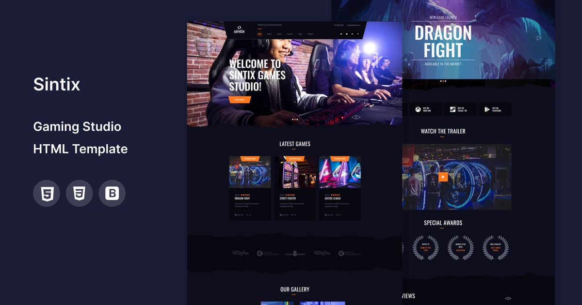 Sintix is the powerful, dark and modern HTML Template for gaming communities. It is perfect for gaming, esports, gaming tournaments, online gaming, live streams and every gaming studio. You can also announce your streams, display a list of your matches with a beautiful layout. The template is a clean, contrast and pixel perfect.